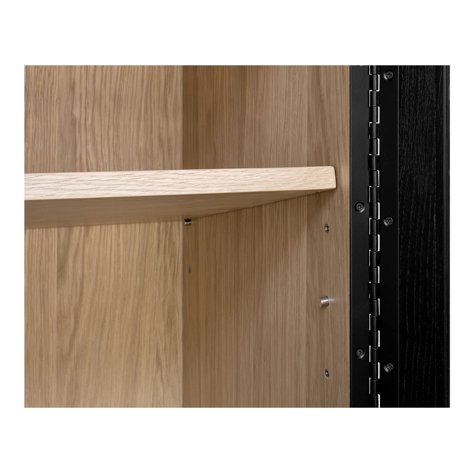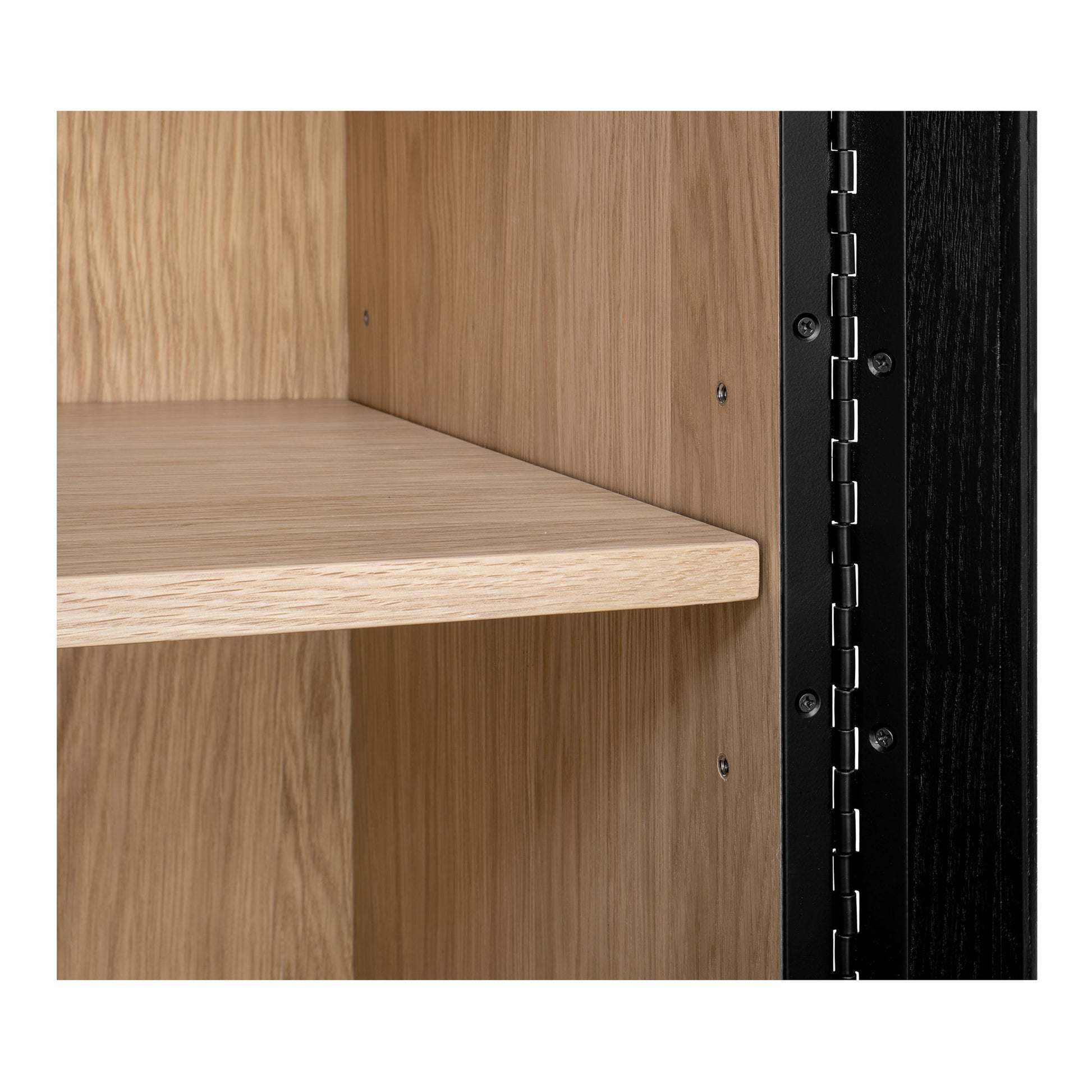 Inspired by the simple elegance of French Cleat handles, the Charlotte tall cabinet features a captivating two-tone design with a sleek black outer frame and natural interior. Tempered glass doors offer a stylish, protective showcase, while three interior drawers neatly store smaller belongings. With its modern and versatile design, this piece balances practical storage with graceful display.