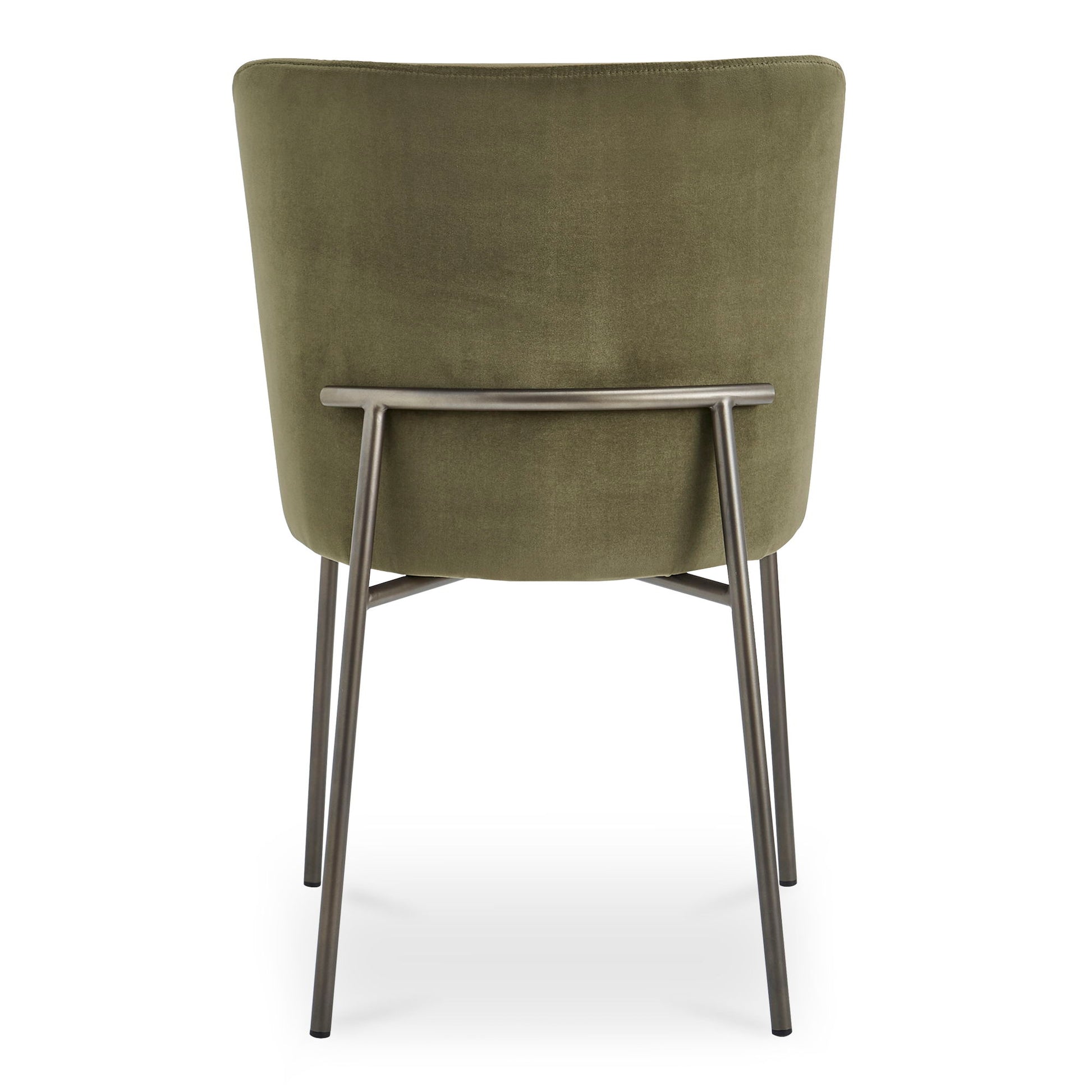 The Early dining chair is an elegant fusion of minimalist design and comfort that features a slim metal frame in a blackened bronze finish. Its seat and comfortably curved back are upholstered in durable faux mohair that resembles velvet’s soft allure but is easier to maintain. It complements any dining setting, especially alongside wooden tables, presenting a clean, cohesive look that invites sophisticated ease.
