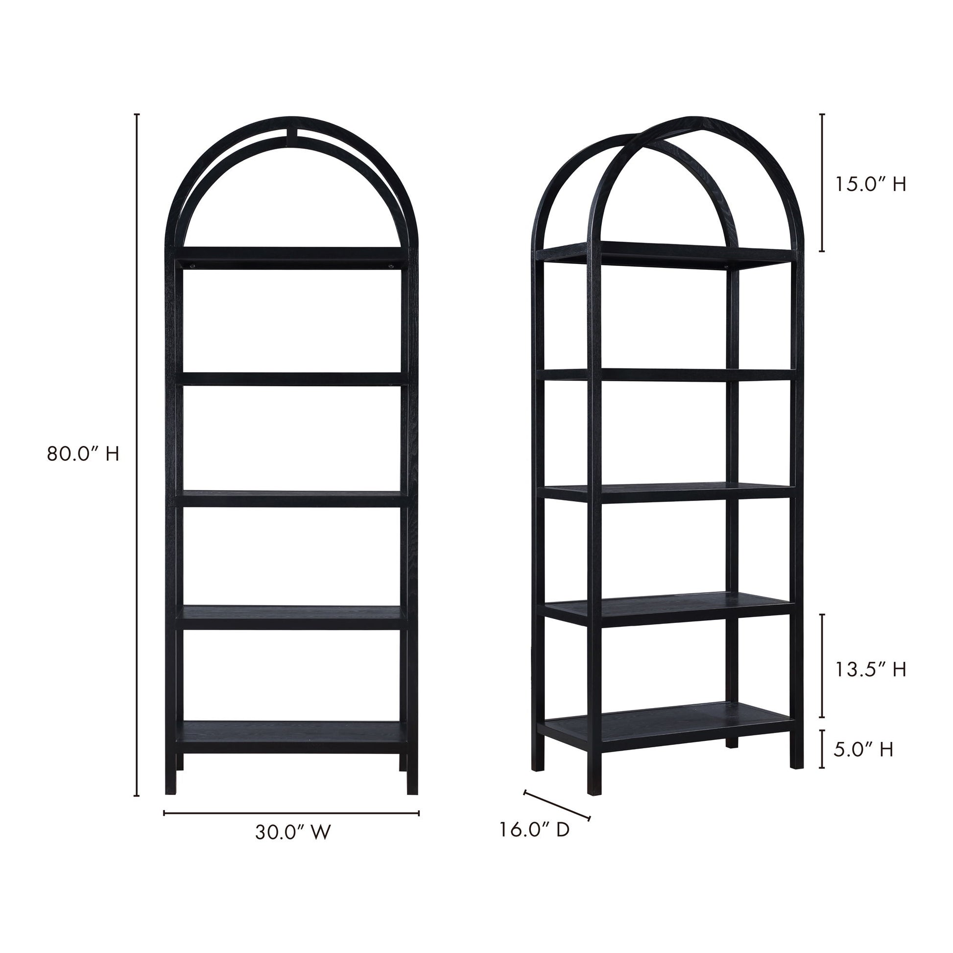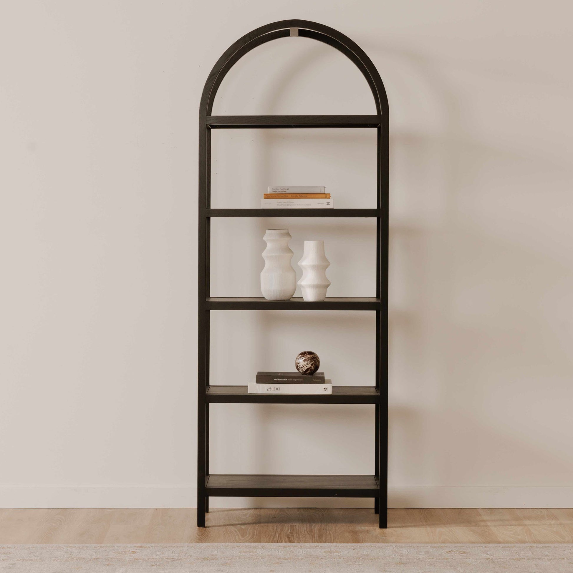 An artistic blend of style and sturdiness, the Eero bookcase features a solid oak frame with oak-veneered shelves ready to display cherished books, keepsakes, and collectibles. Its dark finish engenders moody sophistication, while the arch support is a testament to exquisite architectural design.