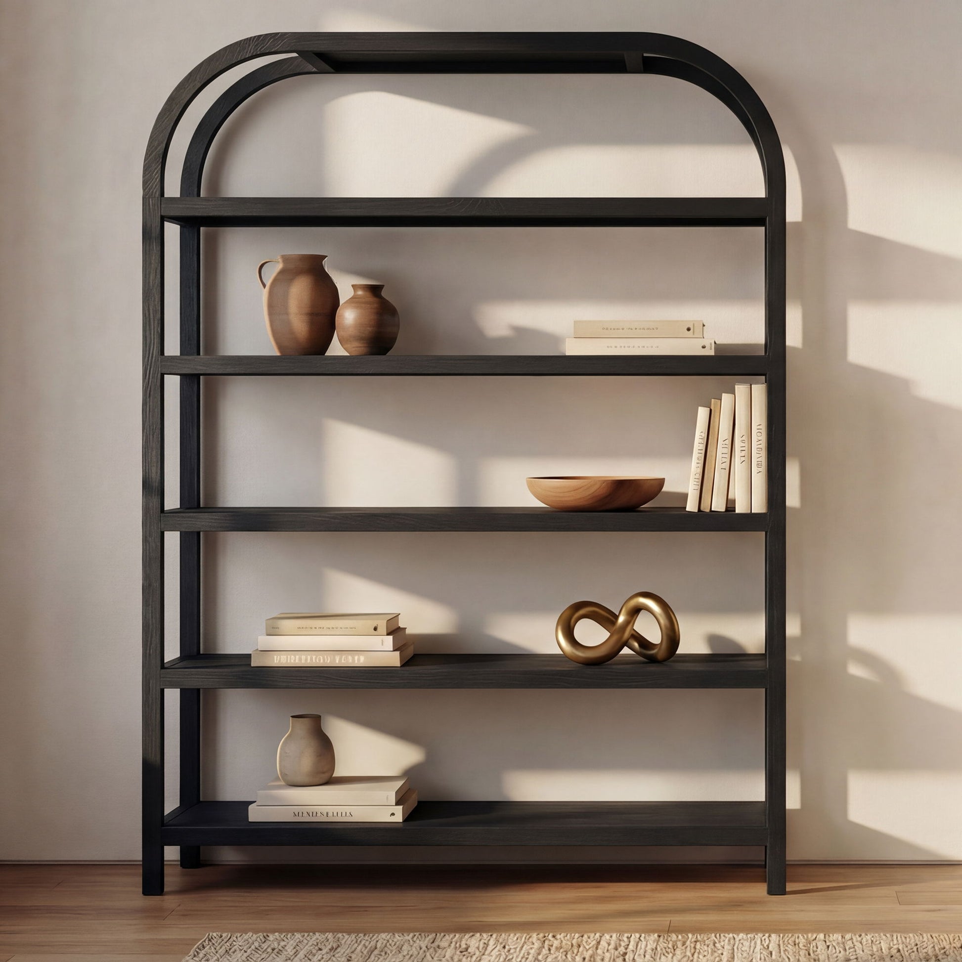 - Arched And Artful: A clean, modern bookcase profile with a sculptural arch support that adds architectural interest without making the room feel busy.