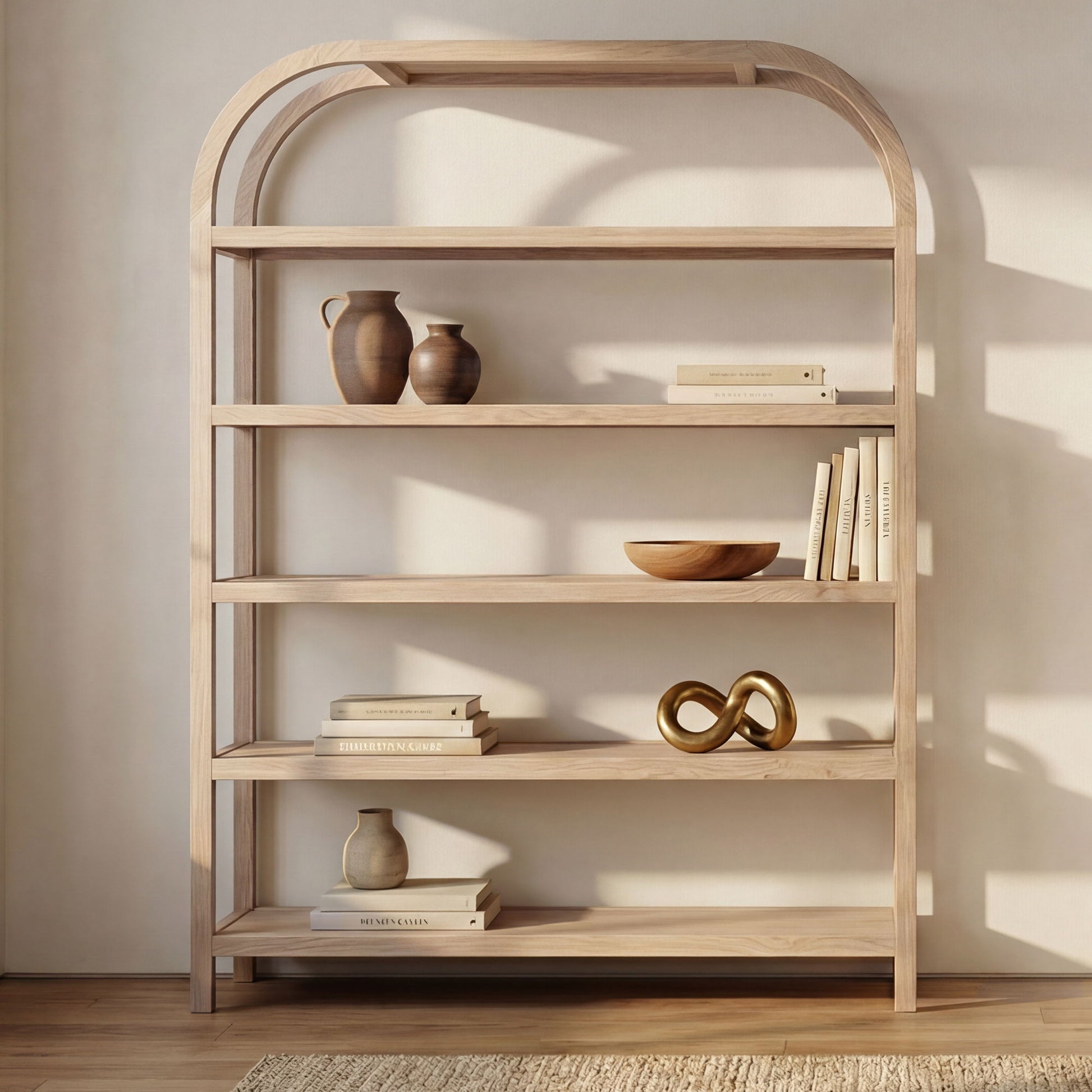 - Arched And Artful: A clean, modern bookcase profile with a sculptural arch support that adds architectural interest without making the room feel busy.