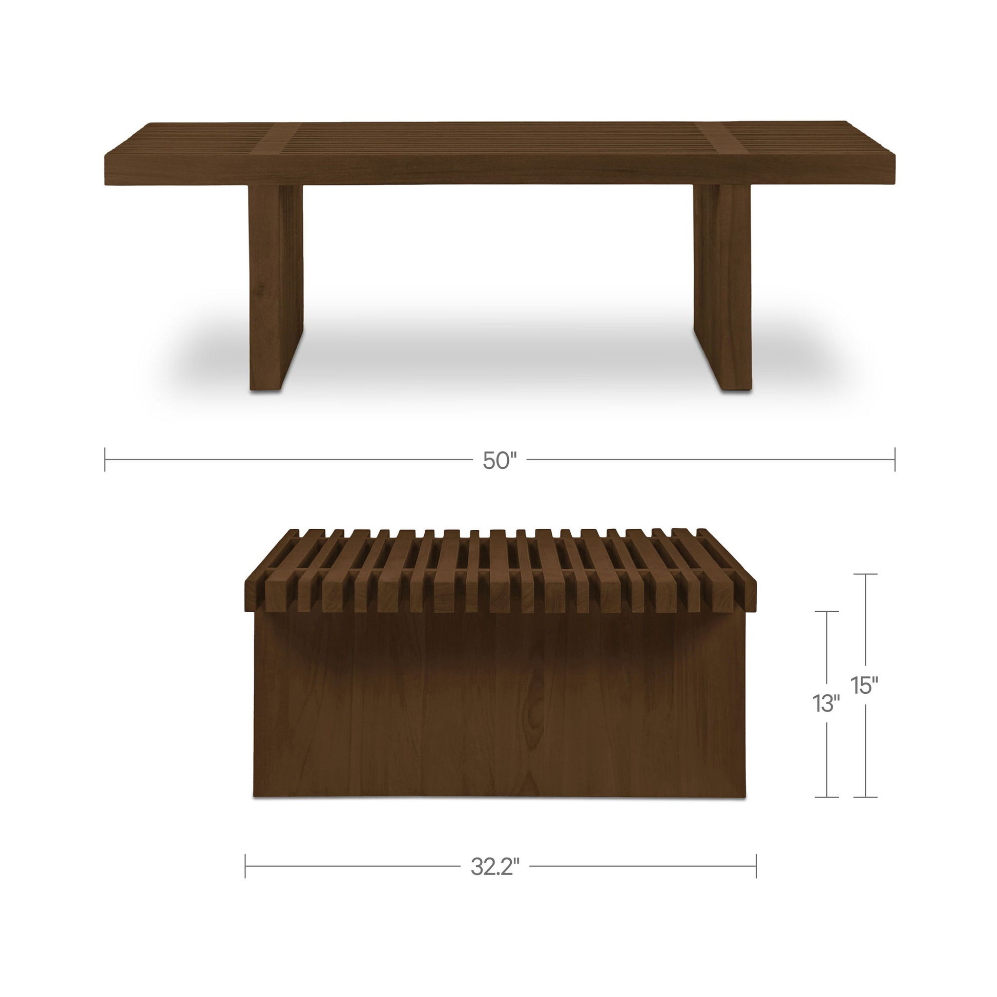 Fletcher keeps it low-key, with solid teak construction that brings quiet strength and natural warmth. Made from solid teak and finished in a toasted tone, it balances substance with softness. A slatted top plays with proportion, mixing wide and narrow planks for texture that feels thoughtful. Slatted, grounded, good to go.