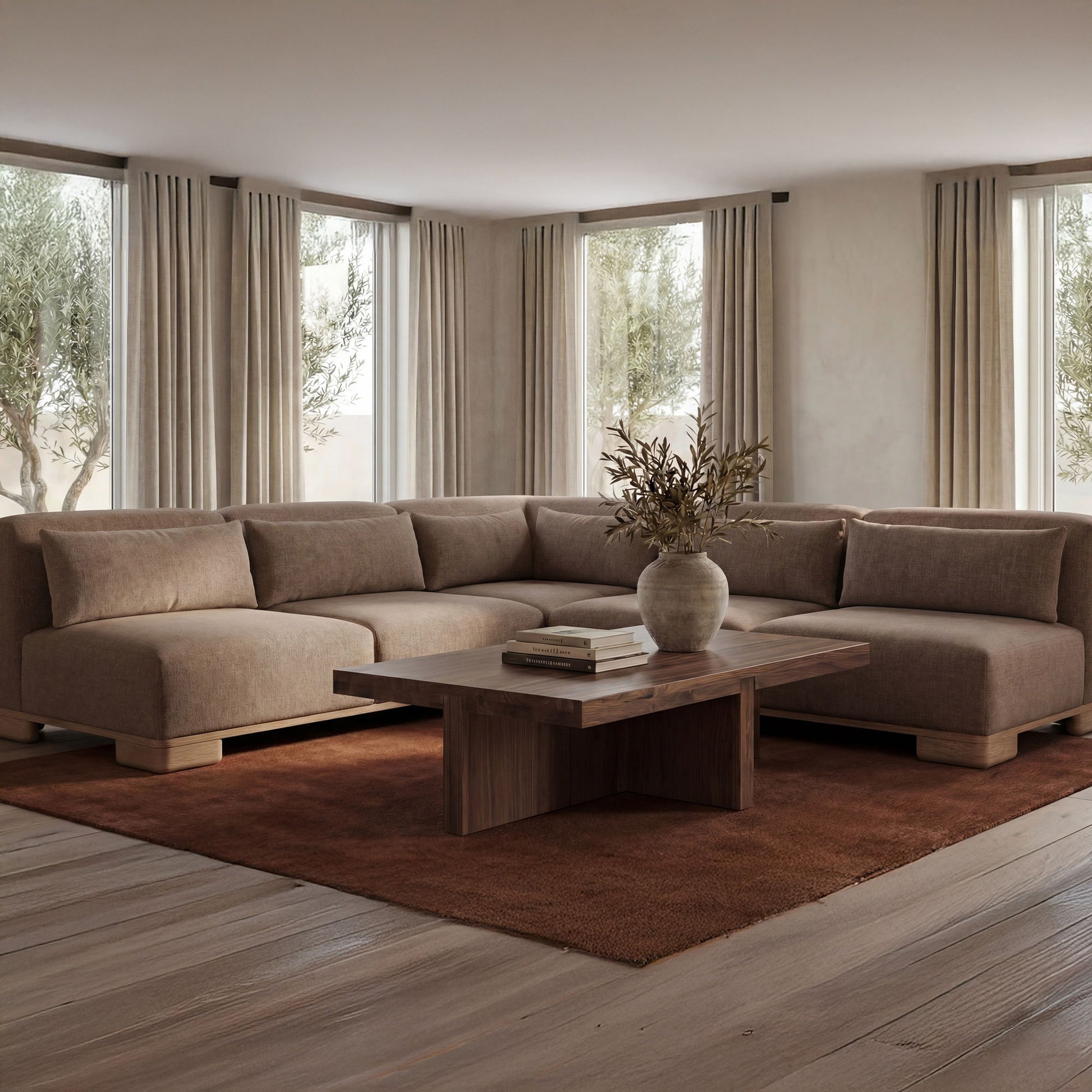 - Modular, Easygoing Lines: Low, lounge-ready profile in dark brown textured fabric, finished with oversized oak veneer legs and base for a warm, grounded look.