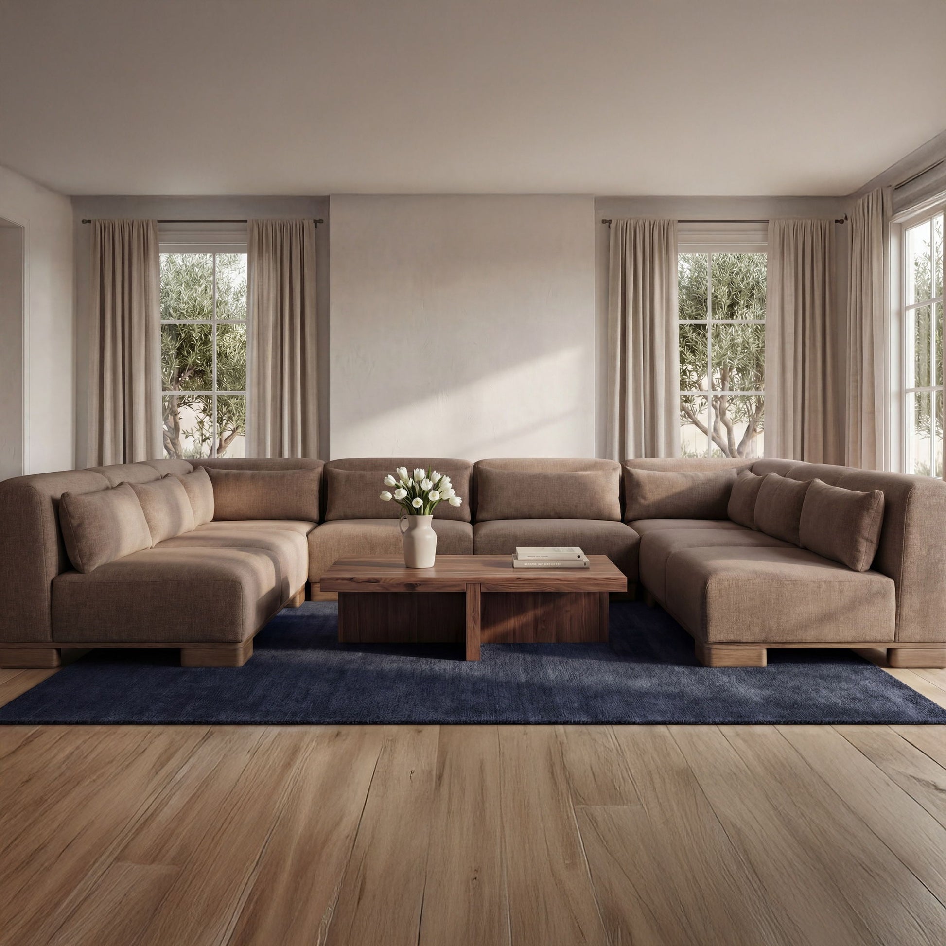 - Modular, Easygoing Lines: Low, lounge-ready profile in dark brown textured fabric, finished with oversized oak veneer legs and base for a warm, grounded look.