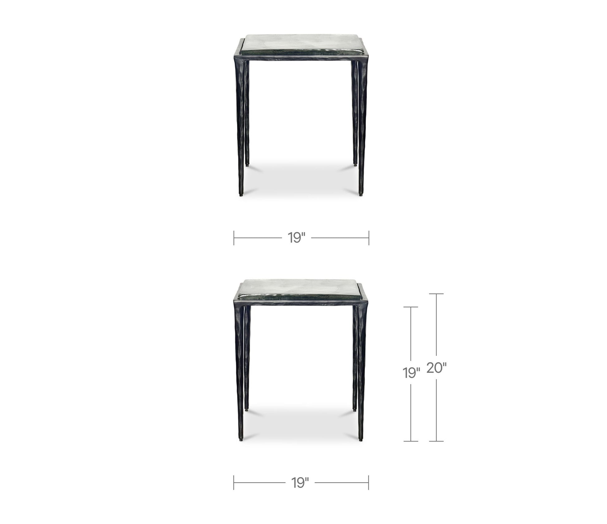 - Cast Glass with Contrast: A substantial slab of textured cast glass with organic veining rests upon a hand-forged, hammered iron frame.