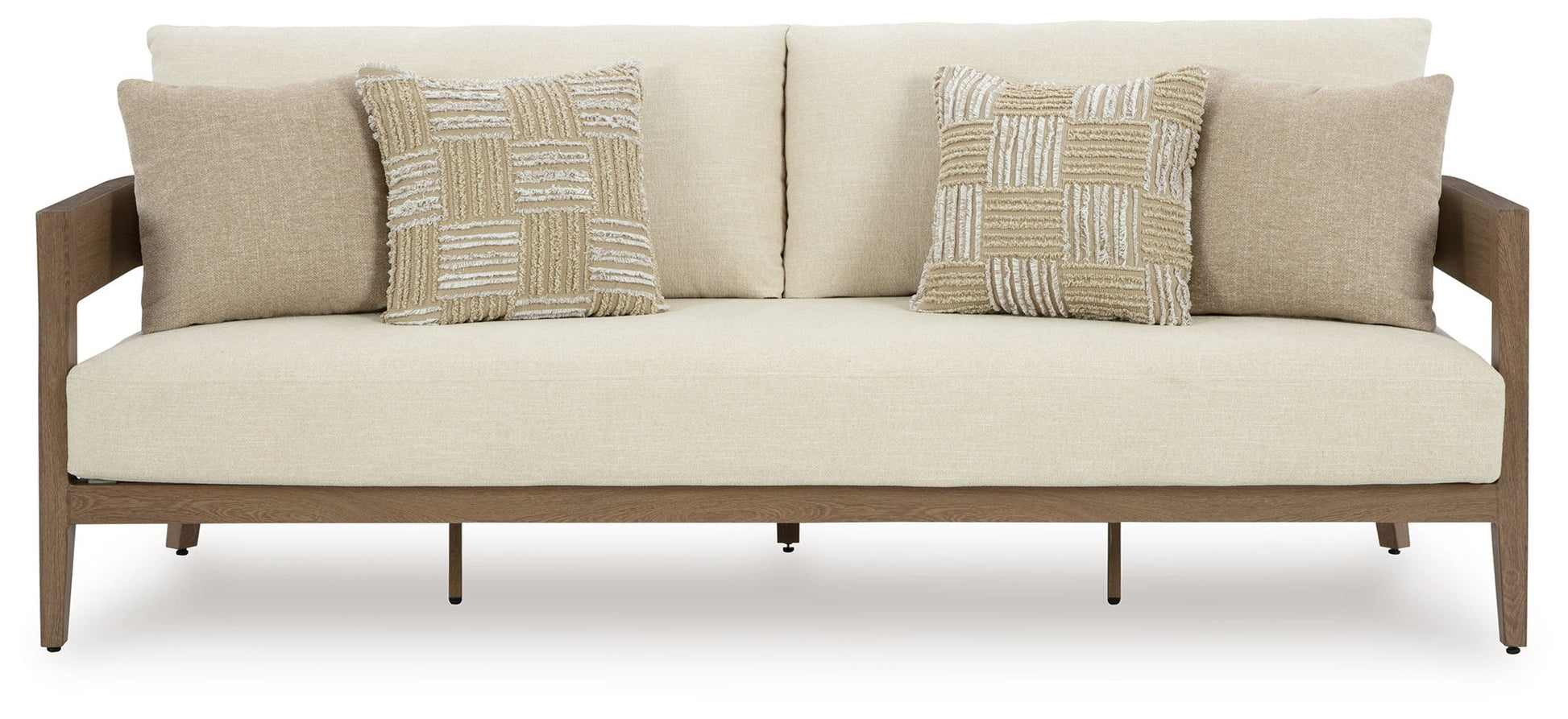 Elevate the appeal of easy-breezy living with this outdoor package. Made to look like wood yet durable enough to weather the elements, it's sure to serve you and your besties well, year after year. The gently curved piece features cushions wrapped in Nuvella+™ high-performance fabric for plush refinement. Patterned accent pillows infuse delightful texture. The gently curved chair features cushions wrapped in Nuvella+™ high-performance fabric for plush refinement. Go ahead and take a smooth spin.