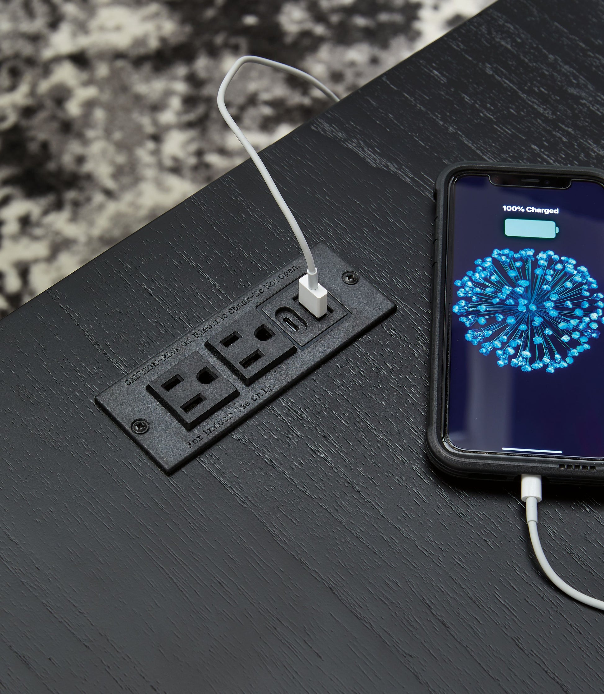 If you are a lover of simplicity, this end table is the perfect choice. Its black finish, casual contemporary design and spacious storage capacity provide functional style wherever it’s displayed. And with conveniently located USB charging ports, this table keeps up with your high-tech lifestyle.