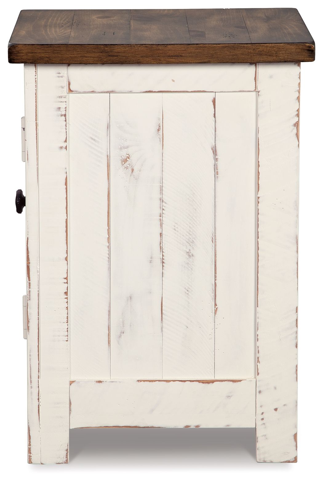 Double take. Sporting a two-tone finish that pairs a distressed vintage white with aged natural pine color, this chairside end table elevates the art of rustic farmhouse living. Enhancing its charm: shelved storage visible through the cabinet door with inset metal grill.